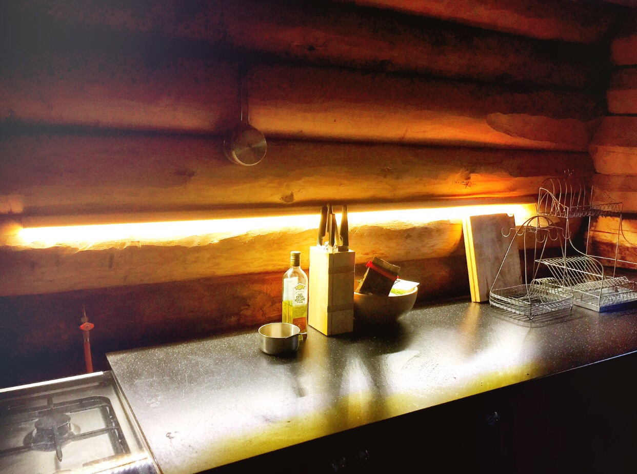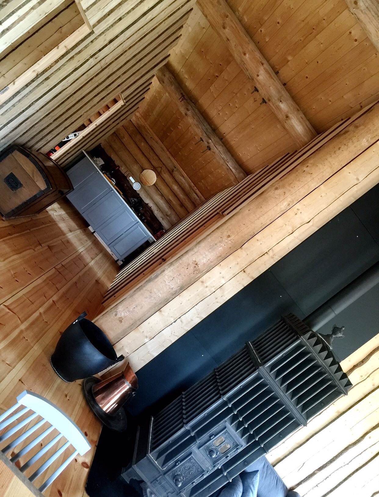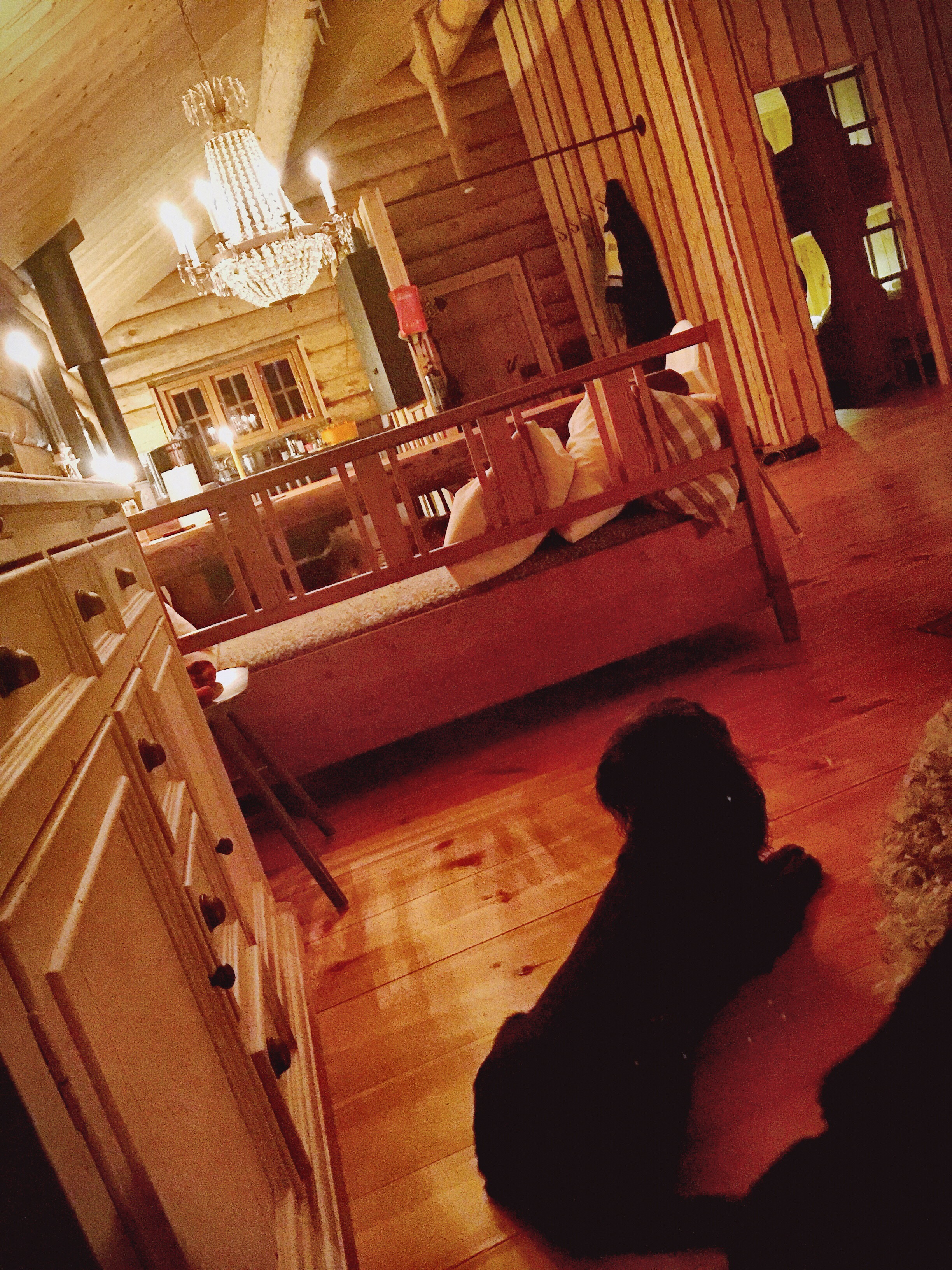 I november, då med betydligt mer snö här än vad vi har nu, fick vi äntligen till belysningen med det 12 voltsystem detta hus numera kan erbjuda. Jag fick hit mitt ”Harry-Potter-Narnia” klädskåp som jag är så nöjd med! Och den fåtölj i hörnet där jag sitter nu.