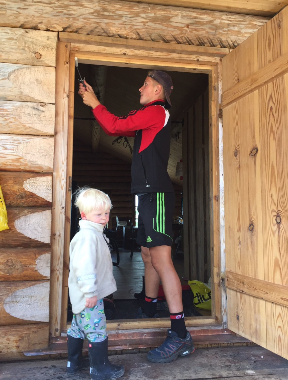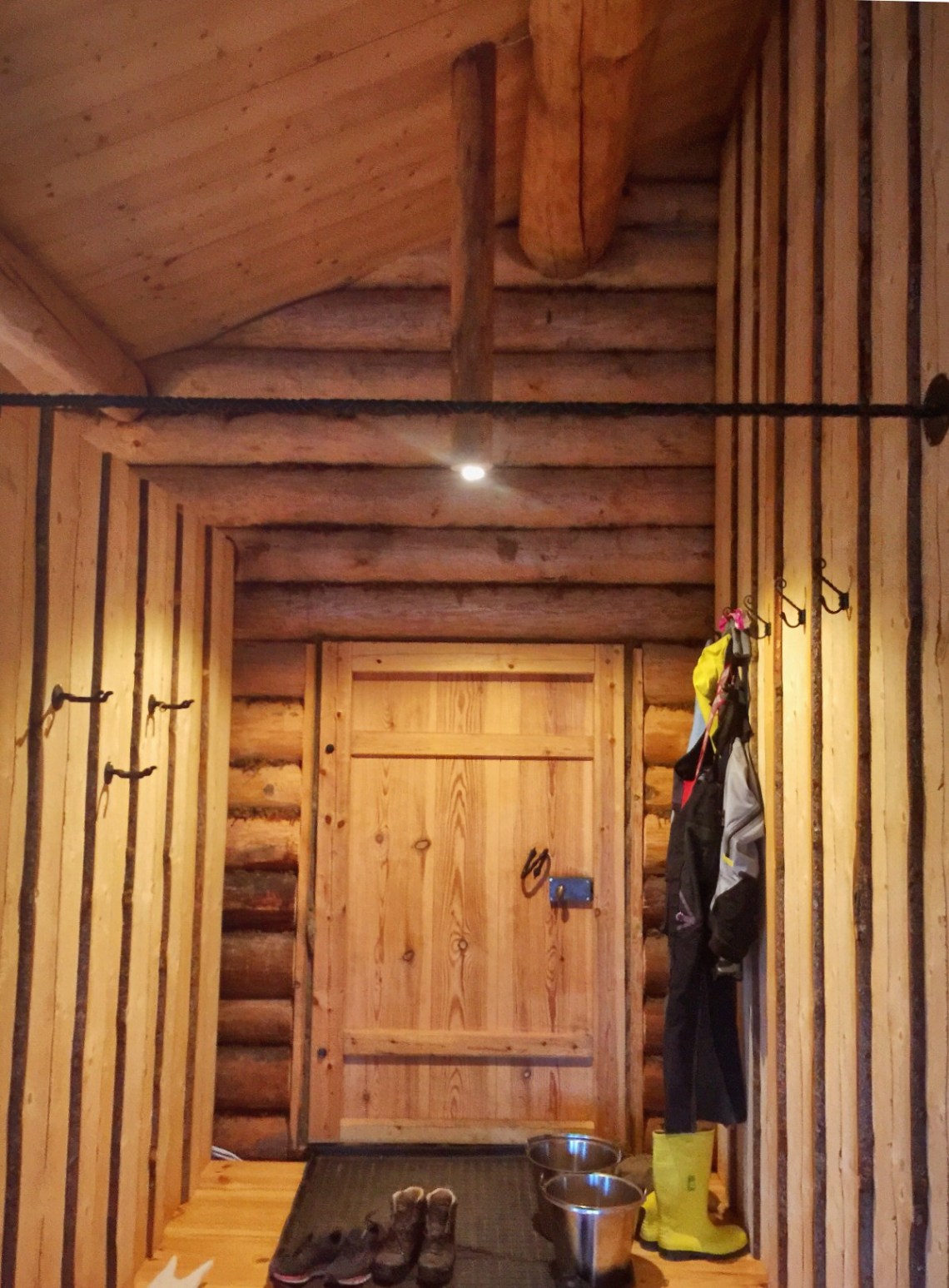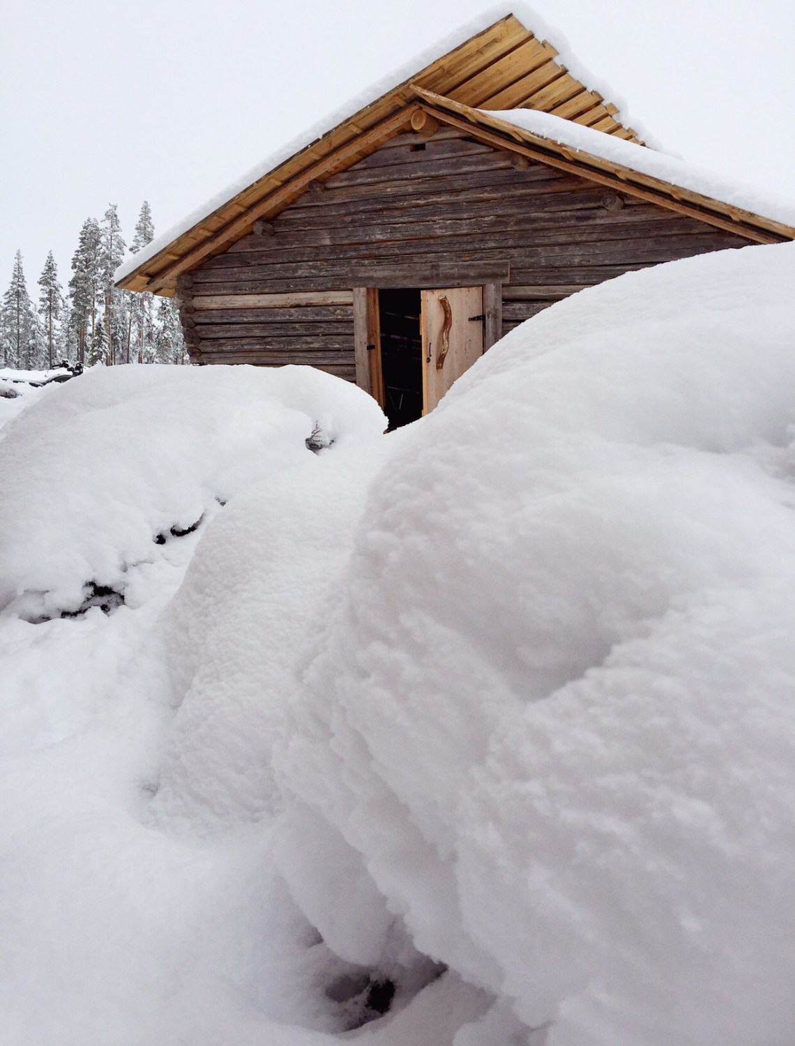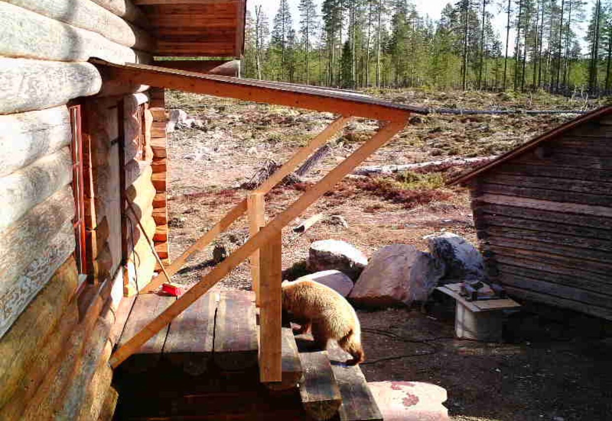 I mars var det mycket snö ute och högar med vildmarkspanel inne på golvet, som behövde köras ut över sjön med släde, då den vägen är betydligt jämnare och rakare än sommarvägen.