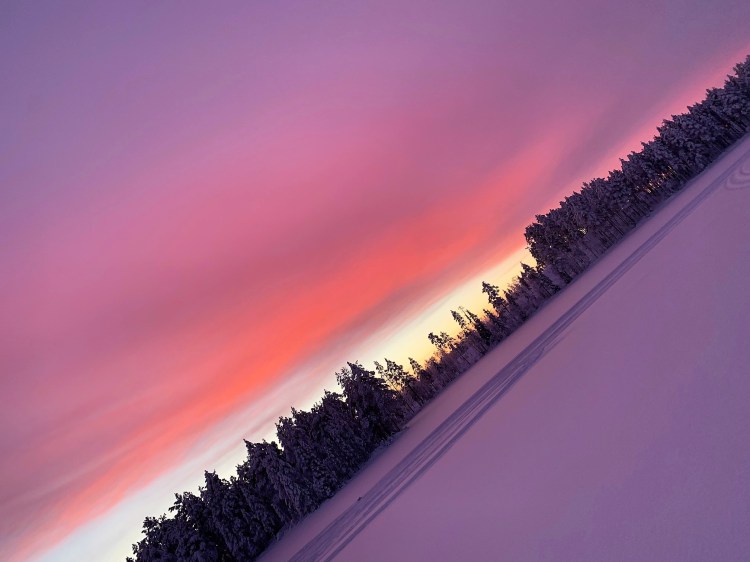 Vi hade bokat in oss på julfrukosten vid caféet inne i byn. Kallt var det, någonstans kring -20 grader, så det gällde att dra hjälmhuvor och mössor tätt runt ansiktet. Vår julafton gick i rosa! Hela världen kändes rosa medans solen var uppe.