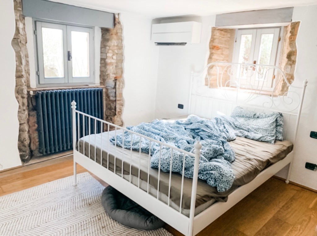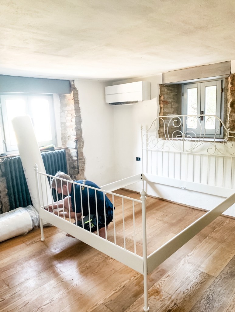 Själva rummet i sig behövde egentligen bara lite färgförbättring och en av tre AC-enheter sitter i lilla M’s rum. Det må kanske vara lite fusk att ha ett luftvärmepumpsystem, men jag skulle inte överleva somrarna i Toscana annars. Det är väldigt effektivt under vintermånaderna också. Det och trappan var våra första prioriteringar i somras.