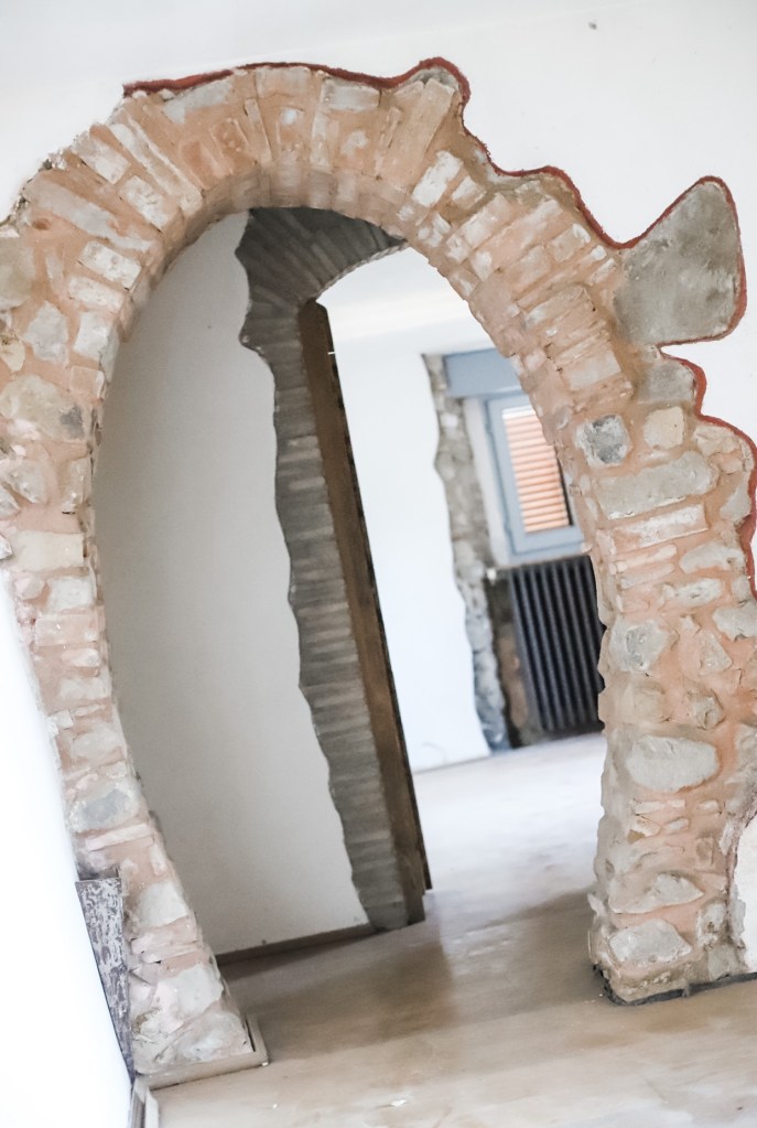 Trappan blev över förväntan! Vi fick flytta på ingången till lilla M’s rum något, vilket innebar att den vackra välvda gamla öppningen fick bli en rak modern öppning, men vi har en ursprunglig portal kvar från vardagsrummet in till det lilla utrymmet nedanför trappan. Lite synd men nödvändigt för lutningen på trappan.