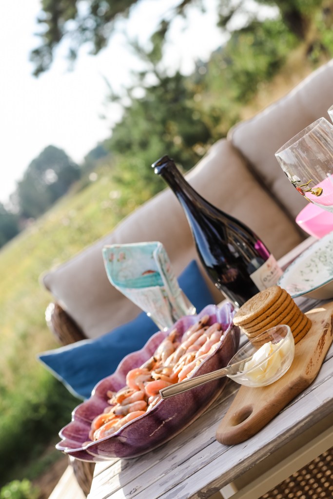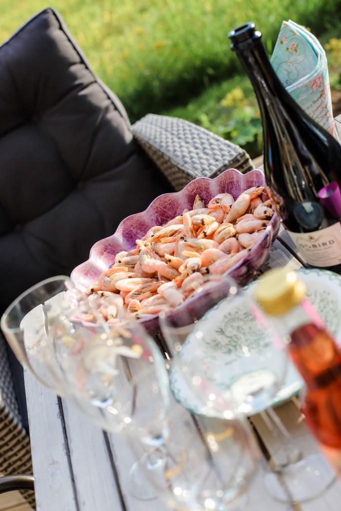 Mammas uteplats, i ljuvlig sensommarvärme, smarriga räkor och vegansk majonnäs blandad med en liten del sambal oelek. Så svårt att låta bli… Det var jättemysigt och fantastiskt gott!