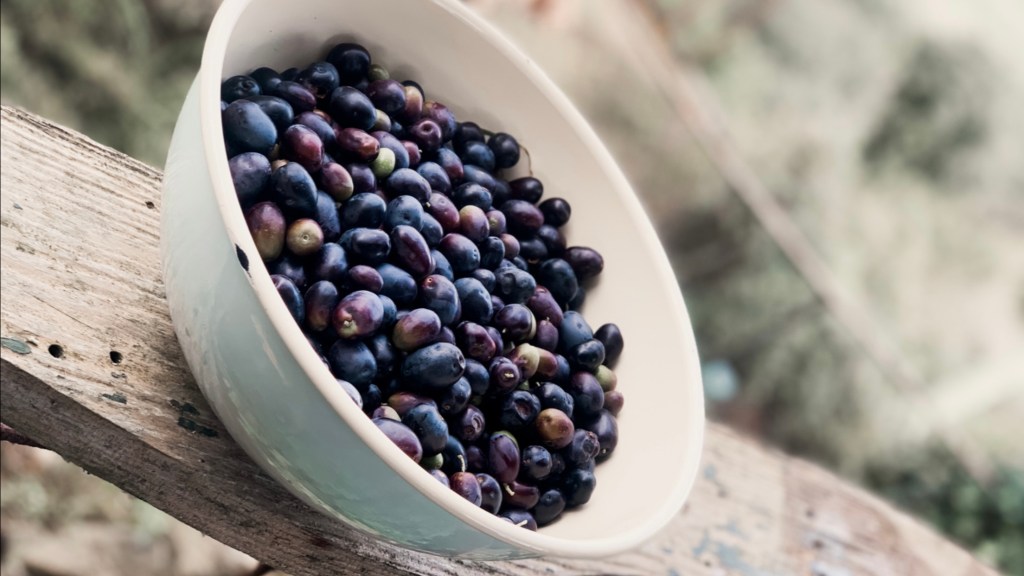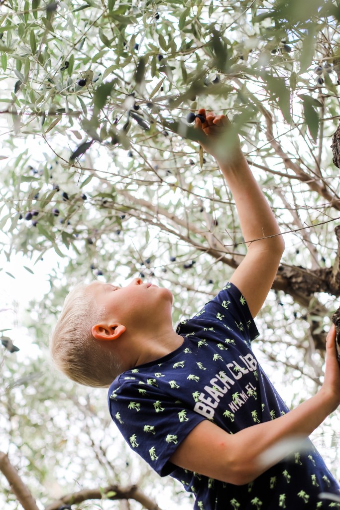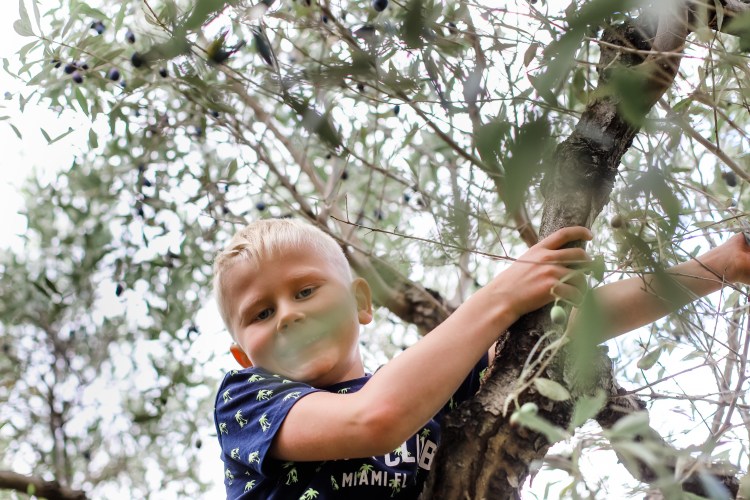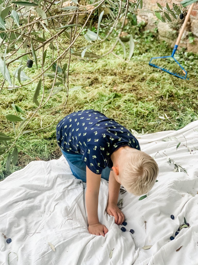 Jag och Minstingen har för första gången plockat av vårt enda olivträd som vi har i vår trädgård. Utan nät och utan rätt typ av kratta. Det står på min önskelista inför nästa år. Nu nöjde vi oss med ett lakan, en vanlig trädgårdskratta och att femåringen själv fick klättra.