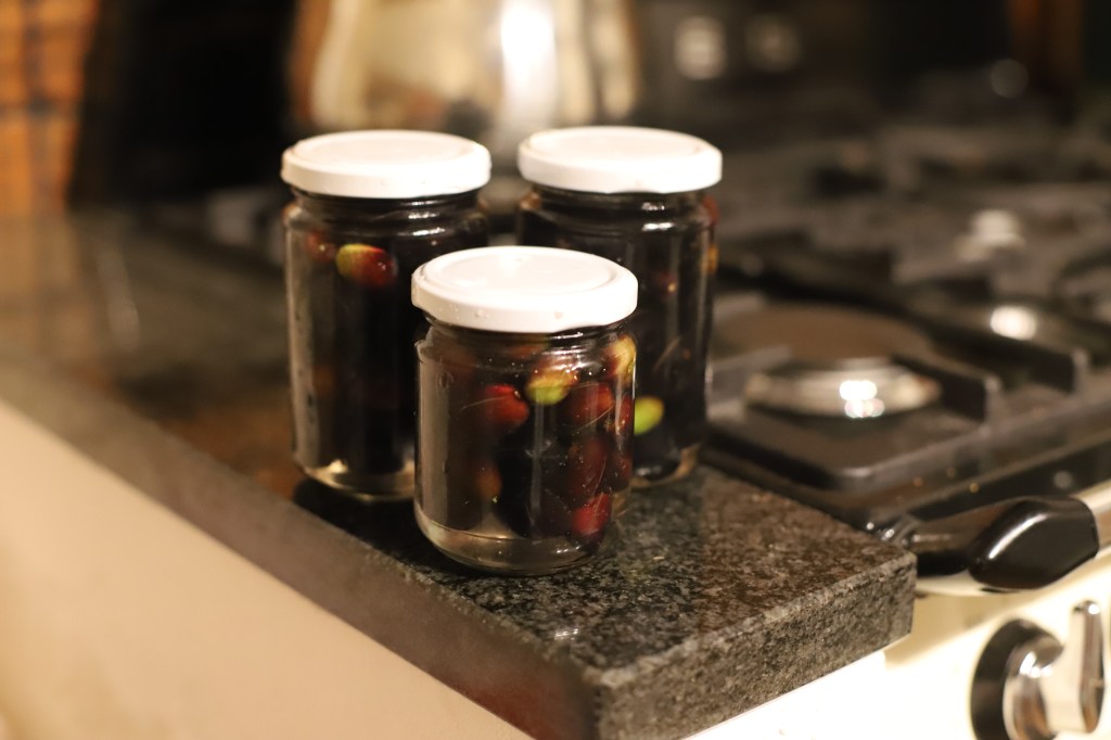 Nu står de där, glasburkarna från butiken här i byn som säljer det mesta man behöver. Fyllda med oliver i saltlag. Enklast brukar bli godast. Minst två månader får locken sitta på innan provsmakning.