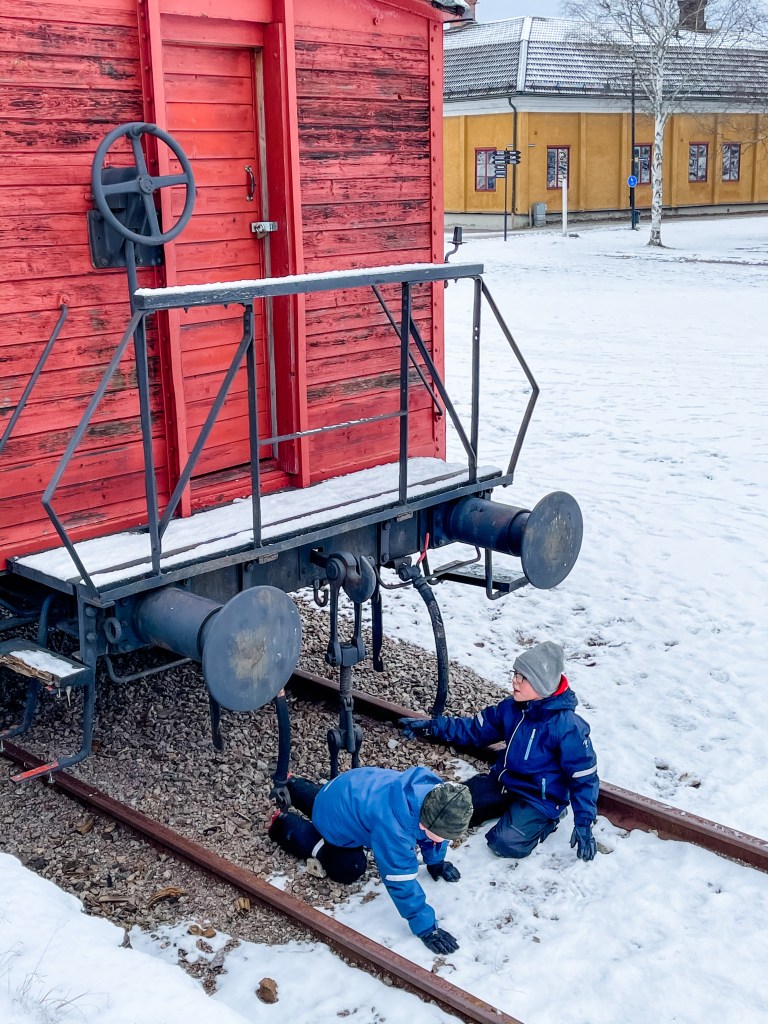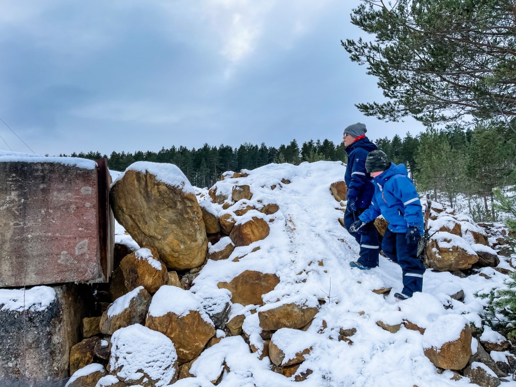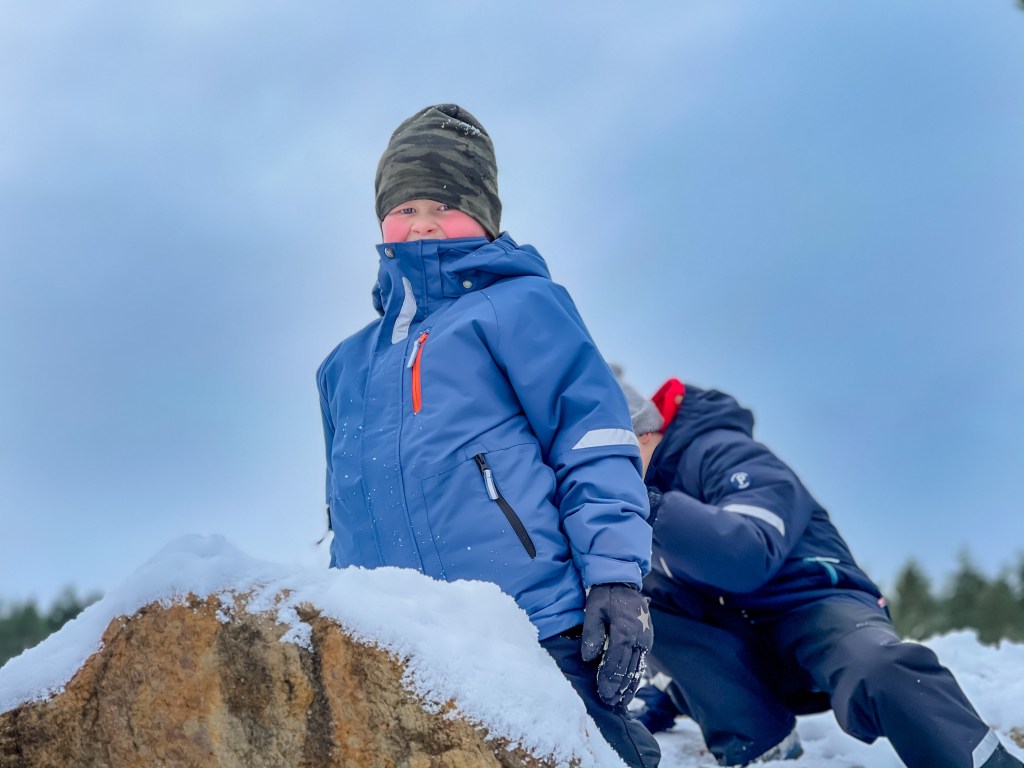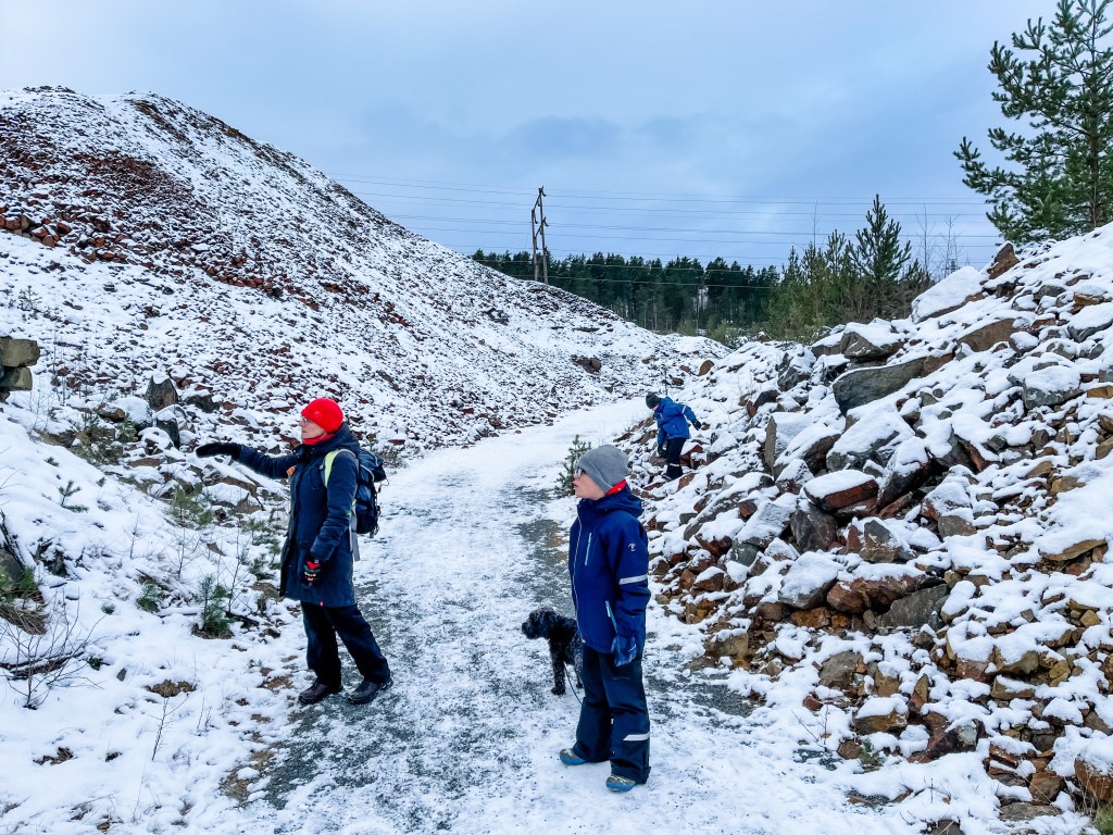 Den yngsta för att det fanns massor av grushögar och stenbumlingar att klättra på. Hans nya vinterutstyrsel i form av jacka och byxor var blå när vi åkte hemifrån. Nu är de vackert Falu Röd-färgade…
