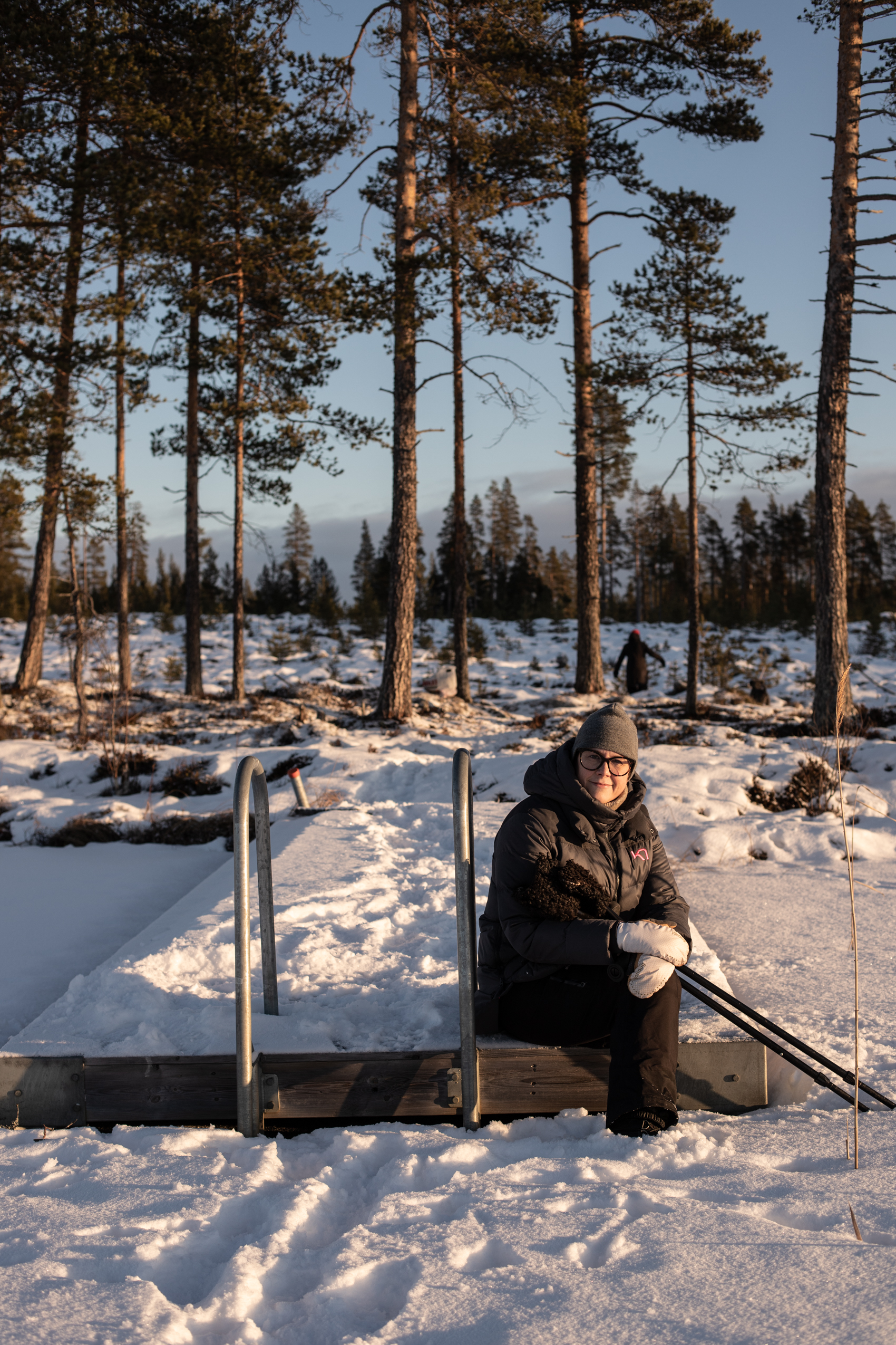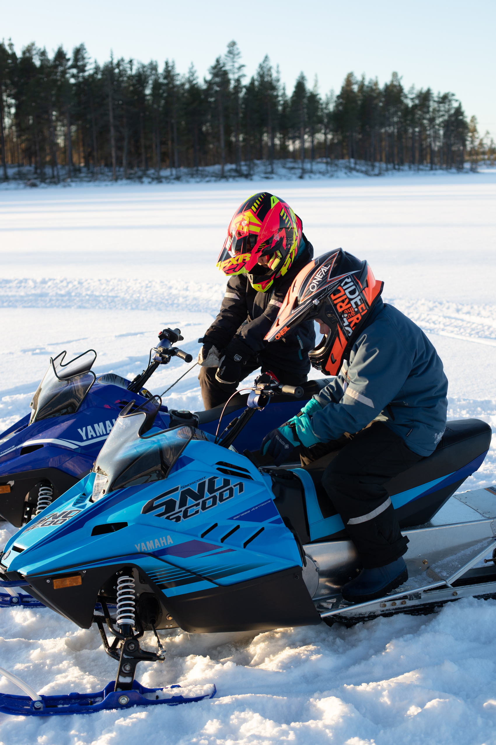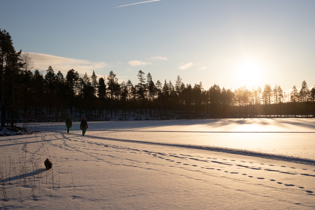 men med stor försiktighet gick det att ta sig upp med skoter och all packning på skogsvägen den här gången. Isarna på sjöarna är däremot perfekta, så vi får hålla oss på dem. I skogen och på skoterlederna går det inte att köra ännu. Där är det för tunt med snö för att inte riskera att förstöra undervegetationen.