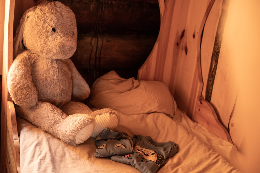 Barnens rum. Tre barn kräver en trevåningssäng. Vi har också ett gästrum med två extra breda våningssängar, så sängplatser finns det om ni letar er hit någon gång. Dessa sängar är byggda av Långsjö Såg hemma i byn i Bolanche. De var tvungna att ställas hit innan vi byggde klart innerväggarna av förståeliga skäl.