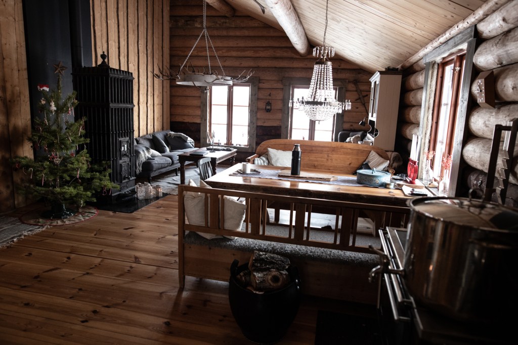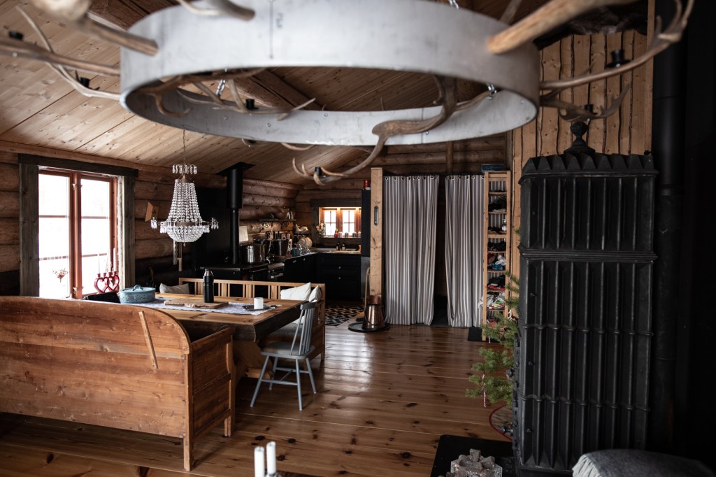Köksbordet är ett hemmabygge av träplank som blev över från golvet. Kökssofforna av helt olika typ är en ett loppisfynd och en är från caféet inne i Nornäs när inredningen där skulle bytas ut. ”Vardagsrumsavdelningen” är relativt ny förutom bordet som följt med sedan min mans mörka inredningstid (tror han måste haft en sådan någon gång i sitt liv). Mattan i rumsdelen och den i hallen är måttbeställda för att täcka golvet precis där det behövs. Det är skönt med mattor i ett sådant här hus, trots att det under förutsättningarna är ganska välisolerat. Ni anar inte hur många lass mossa som plockades för tätning mellan stockarna…