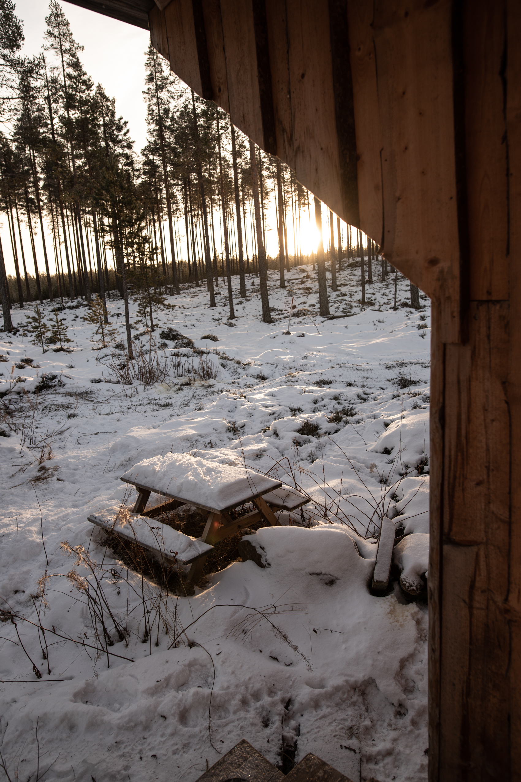 Ladan eller uthuset eller kanske vedboden är ett bättre namn på den lilla timmerbyggnaden mittemot huset. Det finns mycket roligheter innanför de väggarna. Just nu bor Karl-Oskar där, vår belgiska jätte till kanin. Han är ju ute året runt och ta in honom nu skulle ju förstöra för honom när vi kommer hem. Han har fått ett provisoriskt boende bland veden när vi är här. Han verkar gilla det. Han reagerade inte ens över att behöva transporteras hit upp på skoter. Coolingen.