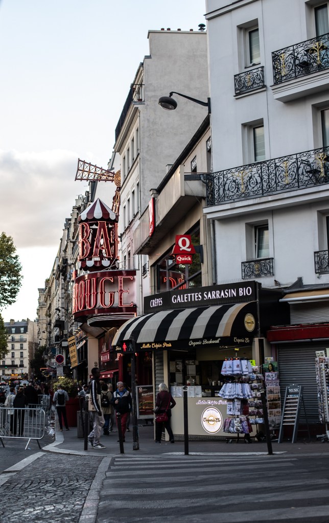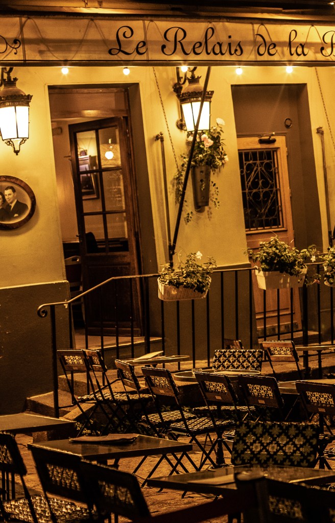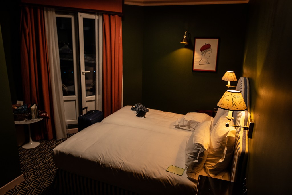 Vi släpar våra redan innan resan överfulla resväskor uppför den otroligt vackra svängda trappan vid en av Gare de Est utgångar. Den där trappan där Amelie i filmen ”Amelie från Montmartre” springer upp när hon jagar honom som petar under fotoautomaten. Han som tar en trampmoped och tappar en av de röda packväskorna. Ni som har sett den vet. Precis där han tappar väskan ligger för den här natten vårt hotell. Noga utvalt av mitt resesällskap. Hon har bott där flera gånger redan.