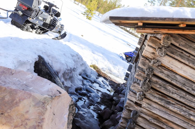 Den har kommit även hit… våren. Det är fortfarande 30 centimeters snö kvar ungefär. Nu skulle man behöva ha vadarbyxor med fasta gummistövlar. Man sjunker igenom djupt överallt. Sjön har alltjämt ganska tjock is, men att ta sig över med skotern är vanskligt. Slasklagret är djupt och du kör fast hur lätt som helst. […]